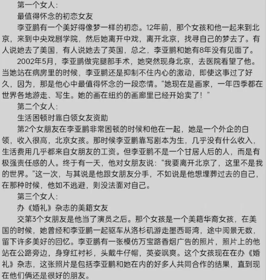 更微妙的一点是,李亚鹏的每一段感情或多或少都涉及劈腿传闻,受伤的总是女方。