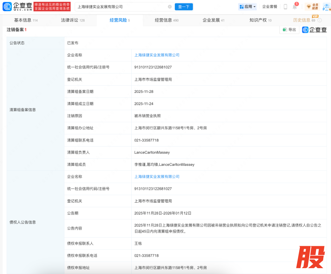 12月3日,据媒体报道,企查查APP显示,近日,上海绿捷实业发展有限公司新增注销备案公告,公告内容为因被吊销营业执照拟向公司登记机关申请注销登记,公告期自2025年11月28日至2026年1月12日。